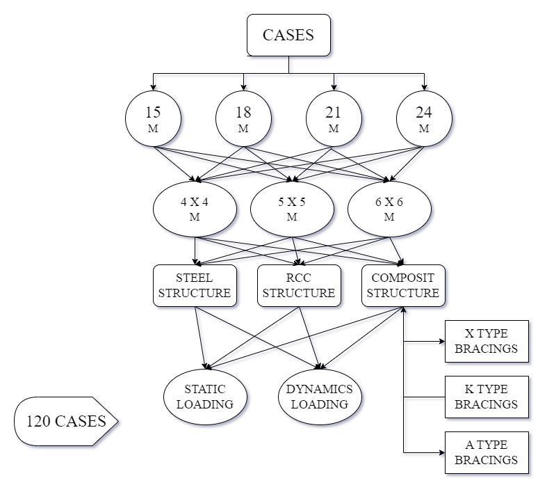 Structural analysis is essential to predict the behavior of buildingsundervariousloadssuchasdeadload,liveload, andlateralforces(especiallyseismicloads).Inthisproject, suitable analytical methods are applied to evaluate the response of different structural systems (Steel, RCC, and Composite) under seismic conditions. The methods are selected based on accuracy, applicability, and code recommendations.
