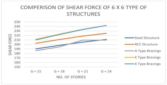 Graph no.6 Comparison of shear force of 6mx6m Type of structure