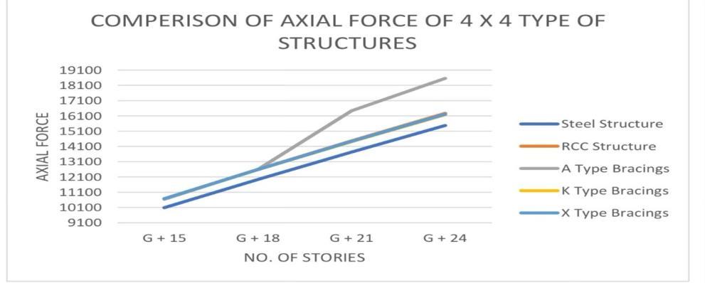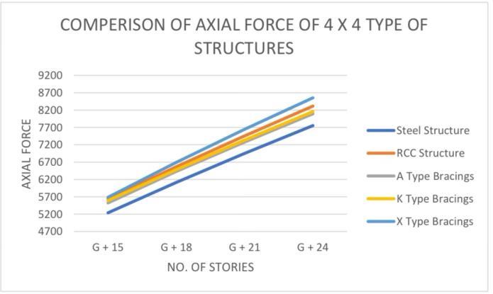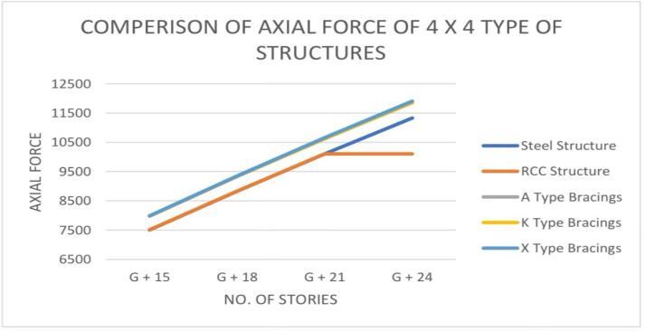 In this sub-point, the axial force results for various structureswithdifferentspanvalueshavebeendiscussed. Thecomparisonoftheaxialforceforallspansanddifferent heights across various types of structures is presented below,