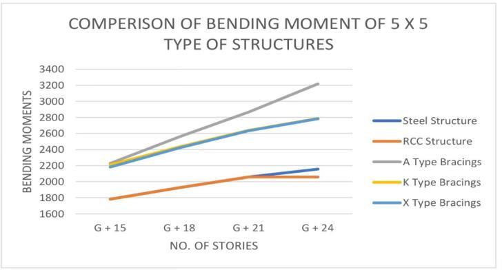 In this sub-point, the bending moment results for various structureswithdifferentspanvalueshavebeendiscussed. The comparison of the bending moment for all spans and different heights across various types of structures is presentedbelow,