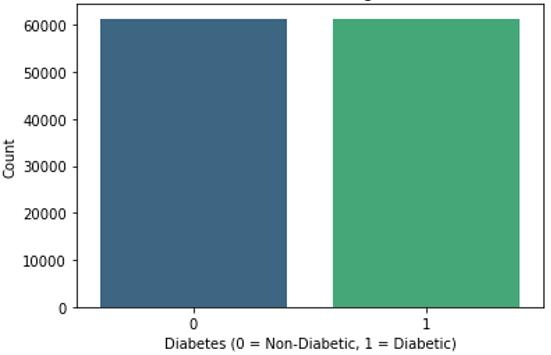 chart -2 shows that the training data distribution has become balanced, with Class 0 (non-diabetic) now representing approximately 50% of the data, and Class 1 (diabetic)alsoaccountingforabout50%.Thisenhancesthe model'sabilitytodistinguishbetweenthetwoclassesand reducesbiastowardthedominantclass.