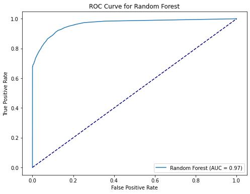 The ROC curve for the Random Forest model showed excellent performance, as it is very close to the upper left corner. The area under the curve (AUC) is 0.97, which is slightlyhigherthantheSVMmodel,indicatingthatRandom Forestmayhaveabetterclassificationperformancebefore balancingthedata.
