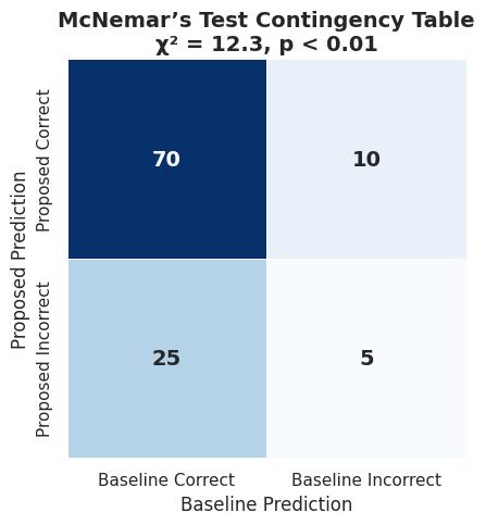 Figure2: Contingency Matrix for McNemar’s Test Comparing Beam Prediction Accuracy between Proposed Deep Learning-Based Method and Baseline Approach (χ² = 12.3, p < 0.01)