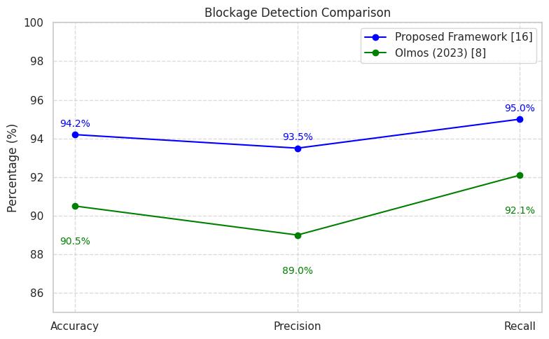 Figure1:LineChartComparingBlockageDetectionPerformancebetweentheProposedFrameworkandOlmos(2023), Demonstratinga3.7%AccuracyImprovementviaMulti-ModalSensing