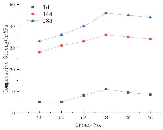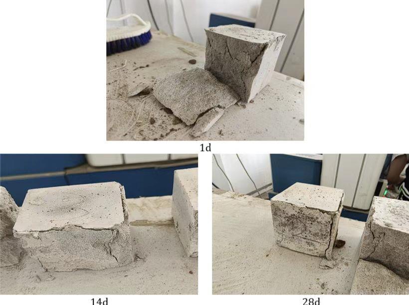 Fig. 3 shows the failure mode of the specimen. With the increase of curing age, the failure degree of the specimen decreases, which is a manifestation of brittle failure characteristics.