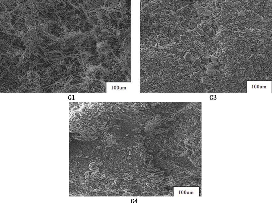As shown in Figure 5, the microstructural morphology of 28-day cured specimens revealed distinct variations with substitution ratios. At 50% RHA substitution (G4), the microstructure demonstrated tightly packed hydration products(e.g.,C-S-Hgels)withsparsesurfaceflocculation. Deviations from this ratio (either higher or lower RHA