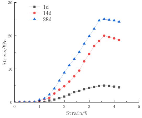 Duringthecompactionstage,thestressincreasesgradually withstrain.Notably,thedurationofthisphaseshortensas curing age progresses. In the elastic deformation stage, minor external loading induces elastic deformation within the cement mortar, while internal microcracks and pores develop slowly. A linear proportionality between stress andstrainisobservedinthisregime.
