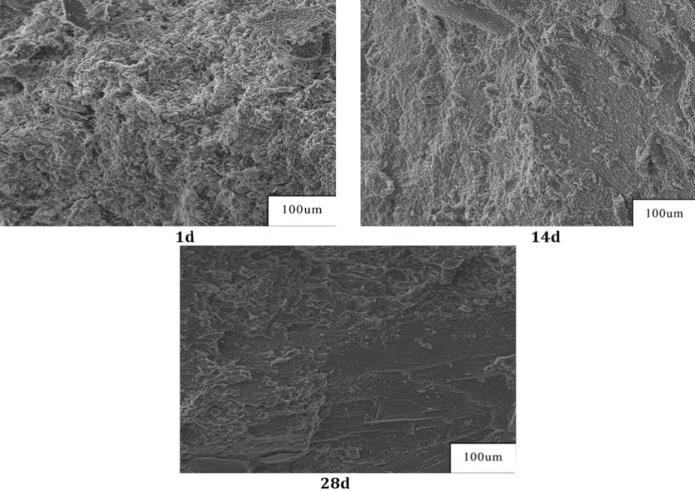 Fig -6: Microstructuralimagesofmortarcontainingrice huskashandsilicafumeatdifferentcuringageswith identicaladditivedosage(G4)."