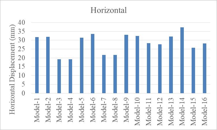 Models such as Model-3 and Model-4 exhibit the lowest horizontal displacement, suggesting effective lateral load resistance,likelyduetooptimizedbracingconfigurations.In contrast, Model-14 shows the highest displacement, indicating poor seismic performance in the horizontal direction. The trend highlights the significant impact of bracingsystemsandbuildinggeometryonlateralstiffness andseismicresponse.