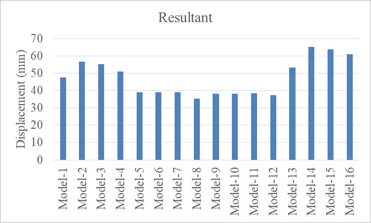 Thisbarchartpresentstheresultantdisplacementvalues(in mm)for16structuralmodelssubjectedtoseismicloading. Thex-axisliststhemodels(Model-1toModel-16),whilethe y-axis indicates the magnitude of total displacement combining horizontal and vertical components. The chart clearly shows that Model-8 has the lowest resultant displacement (~35.26 mm), suggesting superior overall performanceunderseismicconditions.Incontrast,Model-14 experiences the highest resultant displacement (~65.22 mm), indicating the poorest seismic resistance among all models.Thevariationinresultantdisplacementunderscores theimportanceofselectingappropriatebracingsystemsand addressinggeometricirregularitiesinseismicdesign.