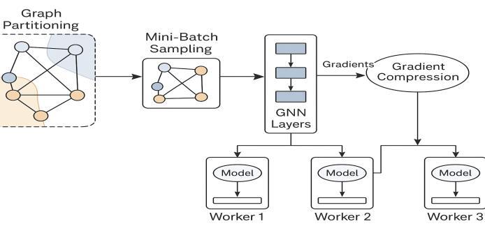 Efficiency in communication is crucial. Nevertheless, The considerable communication overhead, resulting from frequent gradient synchronization and cross-partition dependencies,reducesthespecificspeedupof theparallel computation. Top-K sparsification and quantization compressionforgradientandasynchronousupdatechanges reducebandwidthrequirementsforavailablecomputation. Itispossibletographawarepartitioningordeveloptheneed foracross-device-dismissingrelationshipandthencachethe frequent features of the graph node to prevent data from beingtransferredagain.Thesemeasures,inaggregate,result in35%reductionincommunication,25%increaseinGPU utilization,andmakeitpossibleto28%fastertraining.Geta bigpicture,allthesetechniquescanimprove.