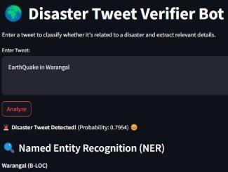 The entity extraction and classification modules process the input tweet "Earthquake in Warangal" in Fig - 5. The tweet is correctly identified by the model as being about a disaster [5], [6]. Additionally, "Warangal" is effectively recognized as a place entity by the Named Entity Recognition (NER)system[3],[10]. Thesystem'scapacity to accurately classify tweets and extract vital information fordisasterreactionandmanagementisshowninFig – 5, [3],[10],[11].