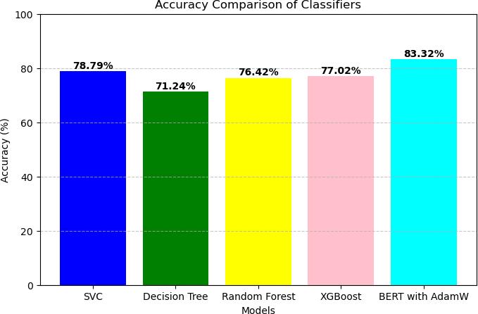 Abargraphcomparingtheaccuracyofdifferentclassifiers is shown in Fig - 4. The graphic makes it clear that the accuracy of the BERT model optimized with AdamW is noticeablyhigherthanthatoftheothermodels[5],[6].