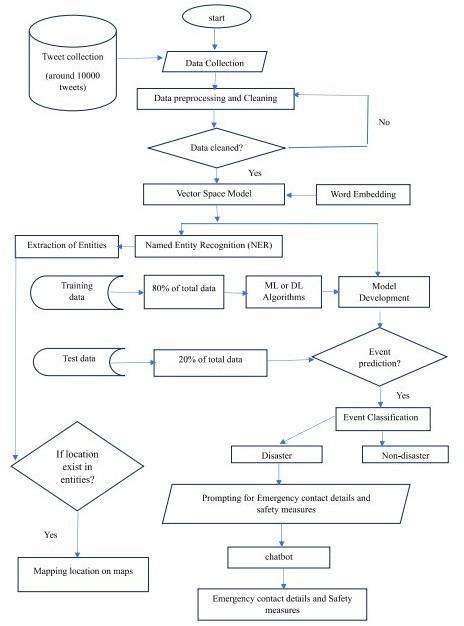 Chatbot Interaction for Emergency Response: The chatbotassistsingatheringemergencycontactinformation to ensure appropriate actions are taken [2], [8]. All the abovediscussedsteps arepictoriallypresentedintheform of a flowchart. BERT with AdamW Optimizer is opted for thisstudyasitresultedingreateraccuracywhencompared to other algorithms [5], [6]. Only if the tweet contains the location,thenitisvisualizedonthemap,elsethelocationis notmappedonthemap.