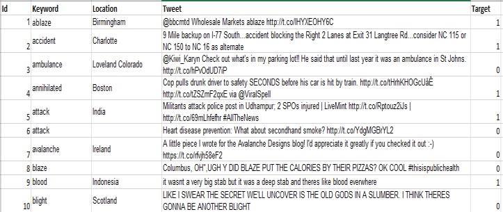 Gatheringandpreprocessingdata: The study's dataset, whichincludedtweetswithmatchingid,keyword,location and target columns. In the binary target column,0 signify tweets that are not related to disasters and 1 signify that the tweets are related to disaster [6], [5]. Figure 1 is the sample dataset that is used for this study. The classification models are trained and assessed using this dataset as the basis. Although the raw tweets are initially supplied in a structured CSV file, preprocessing is necessary to make the text content suitable for model training.