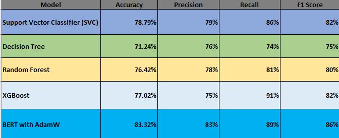 Principal Findings: Conventional Classifiers were outperformed by a Transformer-based model, BERT with AdamWmodelwhichdemonstratedsuperioraccuracyand awell-balancedtrade-offbetweenprecisionandrecall[5], [6]. The utility of pre-trained language models like BERT was highlighted by the fact that traditional machine learning models, although they produced respectable results,hadtroublewithcomplextweetcontexts[2],[6].