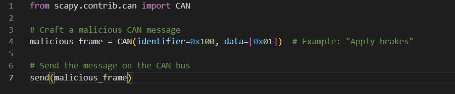 Python’sScapy:APythonlibraryfordevelopingand sending customCAN frames.Inthis project,some messages were written with specific IDs and payloads.