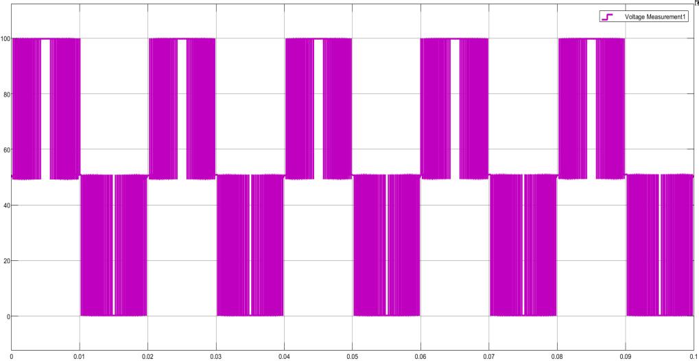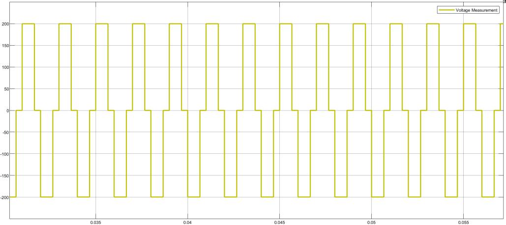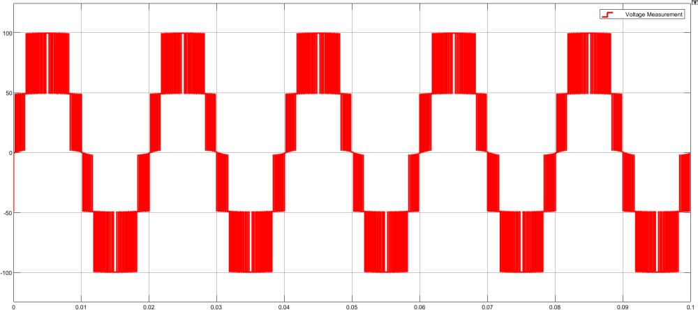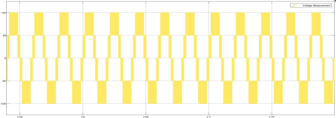 Thefigure representsa PulseWidthModulation(PWM) voltagewaveformtitled"VoltageMeasurement," displayedina timedomain format. The waveform oscillates between approximately +100V and -100V, showcasing a symmetrical square wave pattern.Thisindicatesthatthesignalislikelyusedforpowercontrolormotordriveapplications.Thex-axisrepresentstimein seconds,rangingfromapproximately2.95to3.15seconds,whilethey-axisshowsvoltageamplitude.Therepetitivenatureof thewaveformanduniformpulsewidthssuggestaconsistentdutycycleovertime.Theyellowshadedareasrepresentthehighvoltage state (ON), while the white gaps signify the low-voltage state (OFF). The PWM waveform demonstrates four discrete amplitude levels (around ±100V, ±50V, 0V), indicating a multilevel inverter or digital modulation technique. This pattern is typicalinapplicationswhereefficientvoltageregulationandenergycontrolareessential,suchasinDC-ACconversionorpower electronics.