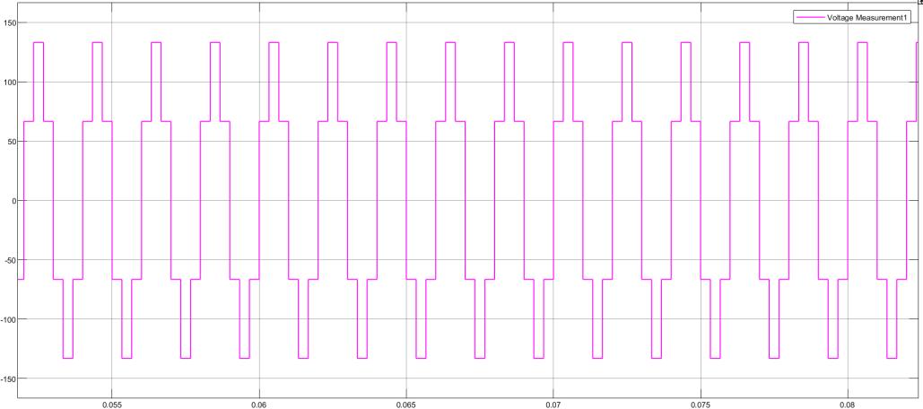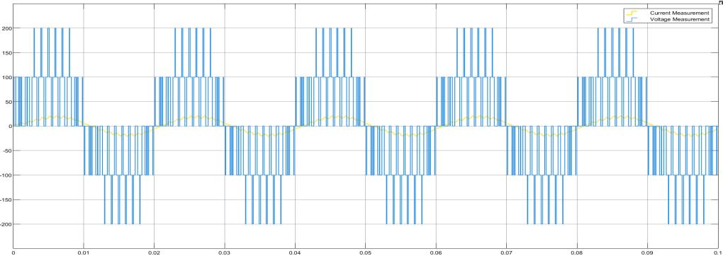 The figure shows the output waveform of an inverter system, displaying both current measurement (in blue) and voltage measurement(inyellow).ThevoltagewaveformexhibitsasteppedPWM(PulseWidthModulation)shape,indicatingthatitis generated using a multilevel inverter or switching logic. This stepped waveform aims to approximate a sine wave but with discretelevels,reducingharmonicdistortion.Thecurrentwaveform,incontrast,issmootherandfollowsasinusoidalpattern, suggestingthepresenceofaloadlikeaninductivemotorwhichfiltersthehigh-frequencyswitching.Thepeakvoltagereaches around±200V,whilethecurrentamplitudevariesaround±50units.Theperiodicswitchingandshapingofthevoltageresultin efficient power delivery with minimal harmonic loss. This type of waveform is typical in applications like variable frequency drives,solarinverters,andmotorcontrolsystems,whereconvertingDCtoACwithcontrolledfrequencyandvoltageisessential.
