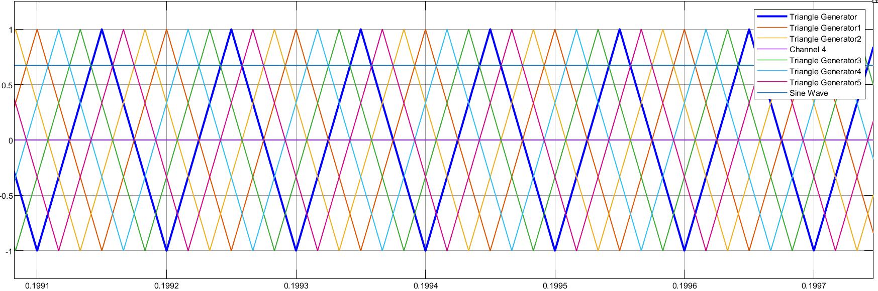 denotestimeinseconds,rangingfromapproximately0.1991to0.1997seconds,whiletheverticalaxisshowsthevoltagelevel for each generator, varying between -1 and +1 volts. Each triangle waveform maintains a consistent peak-to-peak voltage of nearly2volts,reflectingtheirsymmetricalnature.Thesignalsappeartobeevenlyspacedintimewithaperiodicrepetitionof theirphases,demonstratingtheirfunctionalityingeneratingperiodicsignalswithafixedfrequency.Thiskindofwaveform is frequentlyusedinelectroniccircuitsformodulation,audiosynthesis,andtestingapplicationsduetoitslinearslopeandsharp transitions.Overall,theplotillustratesthemultichanneltrianglewavesignalsandtheirrespectivephases.