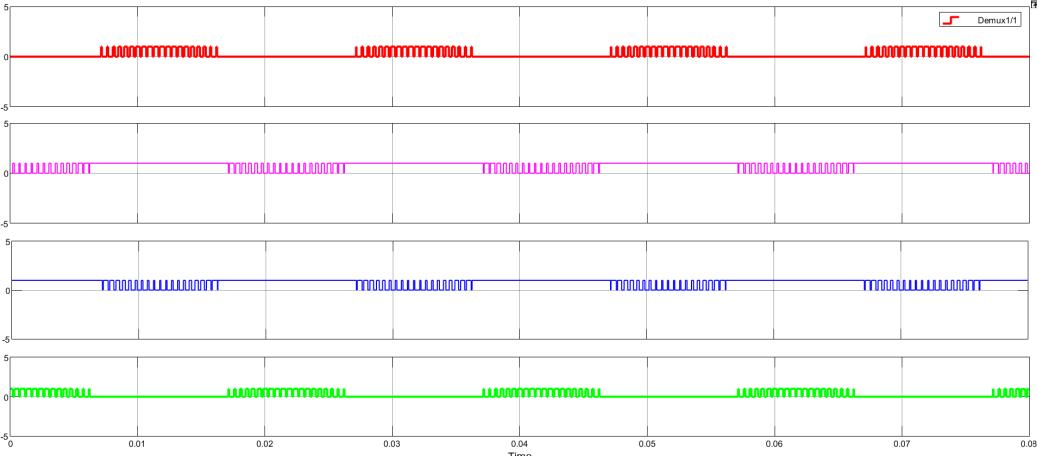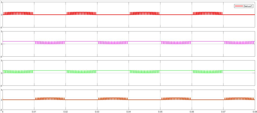 Theabovefigureshowstheoutputwaveformsforademultiplexer(Demux)duringitsoperation.Theplotdisplaysfourseparate channels,eachrepresentedbyadifferentcolor red,magenta,blue,andgreen correspondingtotheDemux’soutputlines. Thehorizontalaxisdenotes timeinseconds,rangingfrom0toapproximately0.08seconds, whiletheverticalaxisshowsthe logic level of each output. The signals exhibit periodic pulse patterns, reflecting their respective enable phases during the simulation. The red output maintains high pulse amplititude close to 5 volts, while subsequent signals follow a similar pulse pattern withslightphasesofdelay.Eachpulsewidthis roughly0.01seconds,which illustratestheDemux’sabilitytoroute a singleinputtomultipleoutputlinesefficiently.Overall,thegraphdemonstrateshowtheDemuxoperatesbyselectingaparticular output while keeping all other lines inactive, thereby validating its functionality in digital communication and data routing applications.