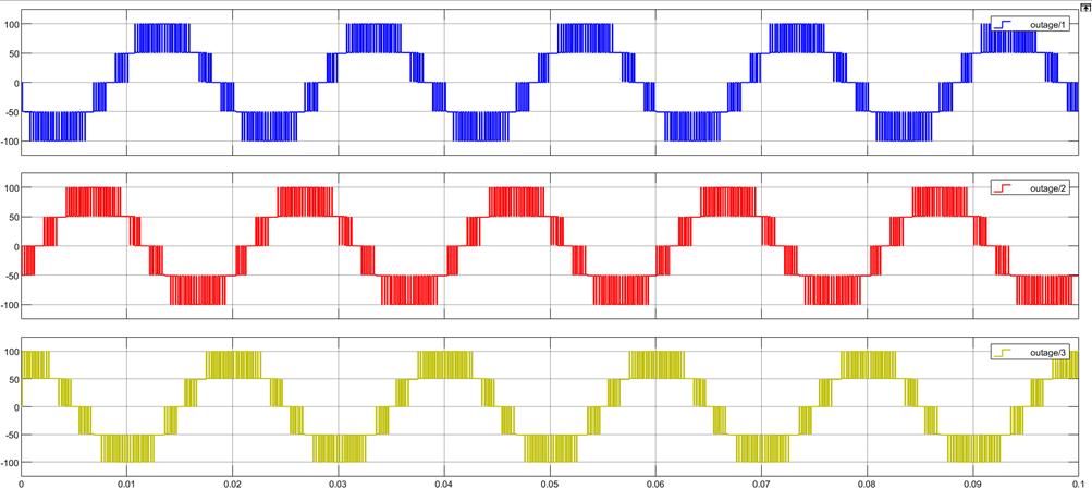 Theaboveimage(Figure5.18)showstheneutral voltagesofthethree-phaseinvertersystem.Thegraphdisplaystheneutral voltagewaveformforeachofthethreephases:PhaseA,PhaseB,andPhaseC(labeledasoutageVan,outageVbn,andoutageVcn, respectively).Thesevoltagesareshownindifferentcolors(blueforPhaseA,redforPhaseB,andyellowforPhaseC).Eachgraph depictsasinusoidalwaveformwithvoltagelevelsoscillatingbetweenapproximately+50Vand-50V,correspondingtothetypical neutral point voltage fluctuations in a three-phase system. The waveforms are modulated by the SPWM technique, which generates pulse width modulation with a varying duty cycle to maintain the desired AC voltage output. The image indicates stableandbalancedneutralvoltagesinathree-phaseinvertersystem,demonstratingthecontrolledswitchingbehaviorofthe inverterundernormaloperatingconditions.