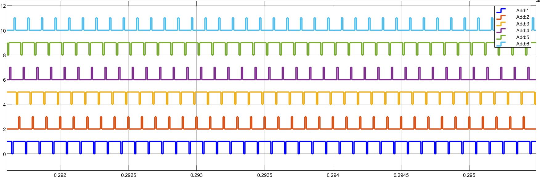 TheabovefigureillustratestheoutputwaveformsformultipleADDoperationsinadigitalcircuit.Theplotshowssixseparate signals each represented by a different color which correspond to the ADD modules’ output lines. The horizontal axis denotes time in seconds, ranging from approximately 0.292 to 0.296 seconds, while the vertical axis shows the logic level or outputvalueforeachADD.Thesignalsexhibitperiodicpulsepatterns,reflectingtheirrespectiveenablephasesandoperational intervals. Each pulse maintains a consistent high or low state for nearly 0.0005 seconds, which illustrates the ADD modules’ ability to perform repeated addition operations at high speed. The signals collectively demonstrate a well-coordinated and synchronized functionality withina digital processingpipeline. Overall,thisplothighlights themultichannel ADDoperations’ outputsignalsandtheirrespectivephases,reflectingtheirroleincomputinganddataprocessingapplications.