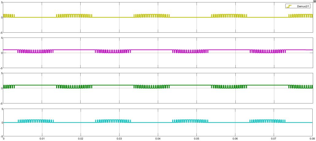 Theabovefigureillustratestheoutputwaveformsfora2-to-1demultiplexer(Demux)duringitsoperation.Theplotshowsfour separatesignals yellow,magenta,green,andcyan eachrepresentingadifferentoutputfromtheDemux. Thehorizontal axisdenotestimeinseconds,rangingfrom0toapproximately0.08seconds,whiletheverticalaxisshowsthelogiclevelofeach output.Thesignalsexhibitperiodicpulsepatterns,reflectingtheirrespectiveenablephasesduringthesimulation.Theyellow output maintains high pulse amplititude close to 5 volts, while subsequent signals follow a similar pulse pattern with slight phasesofdelay.Eachpulsewidthisroughly0.01seconds,whichillustratestheDemux’sabilitytorouteasingleinputtomultiple outputlinesefficiently.Overall,thisplotdemonstrateshowtheDemuxoperatesbyselectingaparticularoutputwhilekeeping allotherlinesinactive,therebyvalidatingitsfunctionalityindigitalcommunicationanddataroutingapplications.