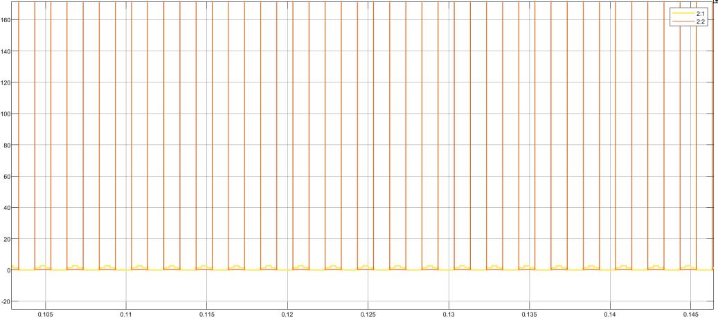 The figure illustrates a comparative plot of two signals labeled as "2:1" (orange) and "2:2" (yellow), likely representing two differentPWM(PulseWidthModulation)outputsorgatepulsesignalsinapowerelectroniccircuit.Theorangewaveform("2:1") consistsoftall,narrowpulseswithapeakvaluereachingapproximately160V,indicatingahigh-frequencyswitchingsignal possiblythegatesignalforaswitchingdevicelikeaMOSFETorIGBT.Incontrast,theyellowwaveform("2:2")showsamuch loweramplitude,around5V,andexhibitssmallripple-likevariationsatthebottom,whichcouldrepresentafeedbackorcontrol signal. The timing of both signals aligns precisely, suggesting synchronization in operation. This figure is useful in analyzing switchingbehaviorandpulsetimingbetweencontrolandpowersignalsinadigitaldriverorinvertercircuit.Theverticalpulse patternsandconsistentspacingemphasizeregularswitchingintervals,whichareessentialforsystemstabilityandperformance.