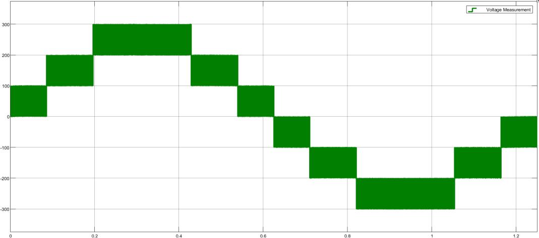 Theabovefiguredisplaysthevoltagemeasurementwaveformcapturedduringasimulatedelectronicoperation.Theplotshows astep-likewaveformwithbothpositiveandnegativeamplitudes.Thehorizontalaxisdenotestimeinseconds,rangingfrom0to approximately1.20seconds,whiletheverticalaxisshowsthevoltagelevelinvolts.Thewaveformstartswithapositivevoltage of +100 volts, then gradually climbs to +200 volts and reaches a peak of +300 volts before descending back toward 0 volts. Subsequently,the voltagedropsintothenegativerange, fallingto -100volts,then-200volts,andfurtherdownto -300volts, reflecting a symmetric pattern. Each step maintains its respective voltage for nearly 0.20 seconds, which illustrates the waveform’s multilevel nature. Overall, this plot demonstrates how the voltage varies over time, which is a crucial aspect in analyzingelectronicsignalsandunderstandingtheirbehaviorinrelatedcircuits.