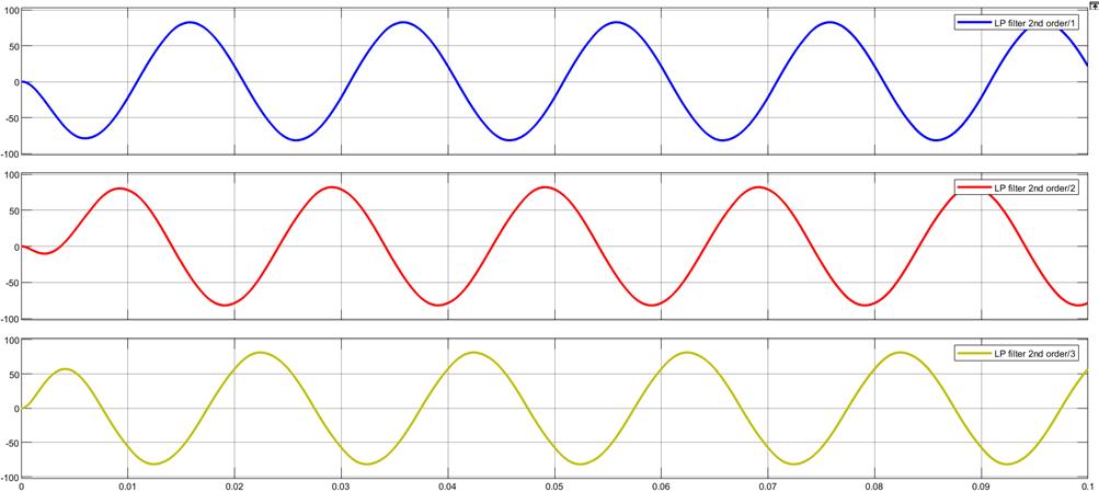 Theimagedisplaysthreesinusoidalwaveformsoffilteredlinevoltages,eachresultingfromapplyingasecond-orderlow-pass filtertodifferentvoltagesignals.Thefirstgraph(blue)representsthefilteredvoltageofthefirstline,oscillatingbetween+100 and-100volts.Similarly,thesecondgraph(red)showsthefilteredvoltageforthesecondline,withasimilaroscillationpattern. The third graph (yellow)illustratesthe filtered voltage ofthe third line,alsoexhibitinga smooth sinusoidal pattern withthe same amplitude range. All three plots show the effectiveness of the low-pass filter in reducing high-frequency noise while preservingtheoriginalsinusoidalwaveform.Thetimeaxisspansfrom0to0.1seconds,andthevoltagevaluesoscillatebetween approximately±100volts.Thisdemonstratesthefilter'sabilitytocleanupthesignalwhilemaintainingthecorecharacteristics ofthevoltagewaveforms.