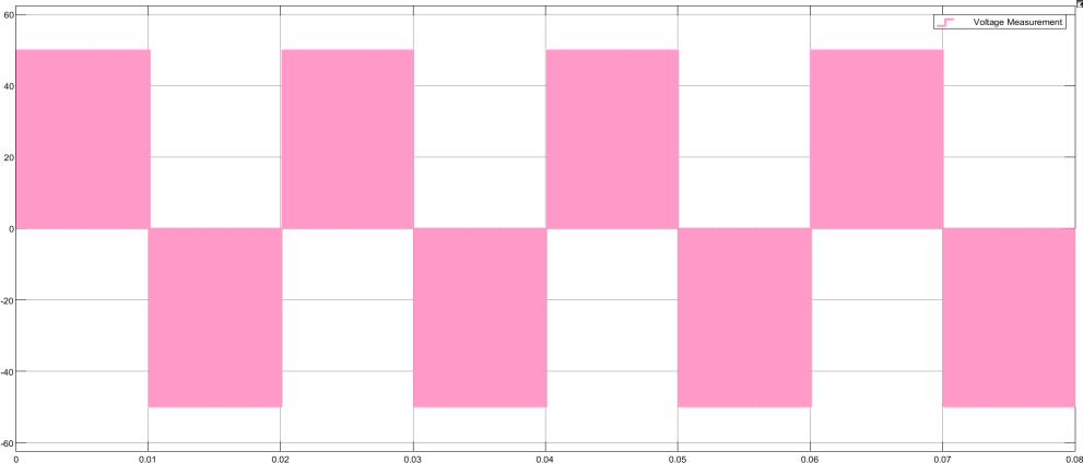Thefigurepresentsabipolarsquarewavesignallabeled"VoltageMeasurement,"withalternatingvoltagelevelsofapproximately +50Vand-50V.Thewaveformexhibitsasymmetricalrectangularshape,indicatingaconstantdutycyclecloseto50%.Thistype ofwaveformistypicallyobservedindigitalsignalprocessingorinvertercircuits,whereasquarewaveisusedtorepresentbinary statesorsimulateACsignals.Thepinkshadinghighlightstheactivevoltageregions,improvingvisualclarity.Eachcompletecycle includesapositiveandnegativevoltagephase,whichhelpsinachievingzeroaveragevoltageovertime adesirablefeaturein applicationslikemotorcontrolortransformerexcitationtopreventcoresaturation.Thecleantransitionsanduniform timing between high and low states indicate precise switching, essential for efficient and stable operation. The regularity of the waveformconfirmsitasastableandreliableoutputsignalfromadigitalorpulsegenerationsystem.
