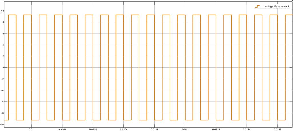 ThefiguredisplaysaPulseWidthModulated(PWM)outputsignalwithalternatingvoltagelevelsrangingfromapproximately +125Vto-125V.Thewaveformconsistsofasymmetricalrectangularpattern,suggestingbalancedhighandlowpulsewidths overtime.Thefrequencyappearsrelativelyhigh,andtheconsistentpulseintervalsindicateasteadyswitchingoperation.This type of signal is typical in inverter circuits or digital control systems for modulating power to devices such as motors or transformers. The waveform demonstrates narrow and wide pulses in a repeating pattern, which is a common approach to simulatesinusoidalwaveformsinpowerelectronicsbycontrollingtheaveragevoltage.Thecleartransitionsandstablepulse levelsensureeffectivepowerdeliverywhileminimizingdistortion.Themagentacolorofthetracerepresentsthesignallabeled "Voltage Measurement1", helping differentiate it visually during analysis. Overall, the waveform indicates an efficient and controlledPWMprocessusedforvoltageregulationorwaveformsynthesis.