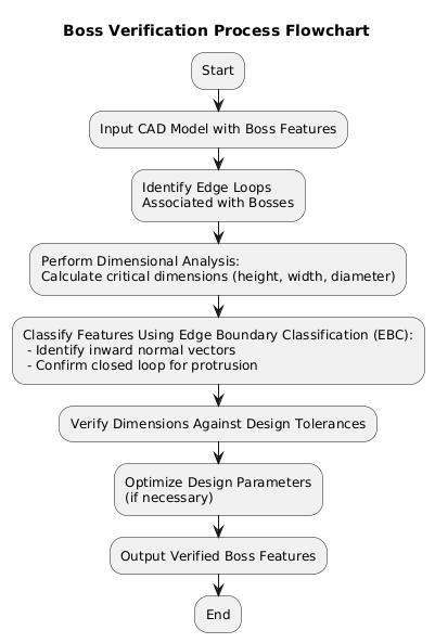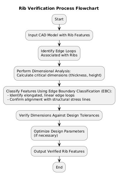 Bossesaretypicallyidentifiedbyclosedloopswithinward normal vectors, suggesting a protrusion from the surface, whereasribsareflaggedbytheirelongated,strip-likeedge loops,whichusuallyalignalongthestresslinesorstructural reinforcementsofthecomponent.Fig8showsVerification ProcessFlowchartforRibsandBosses