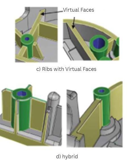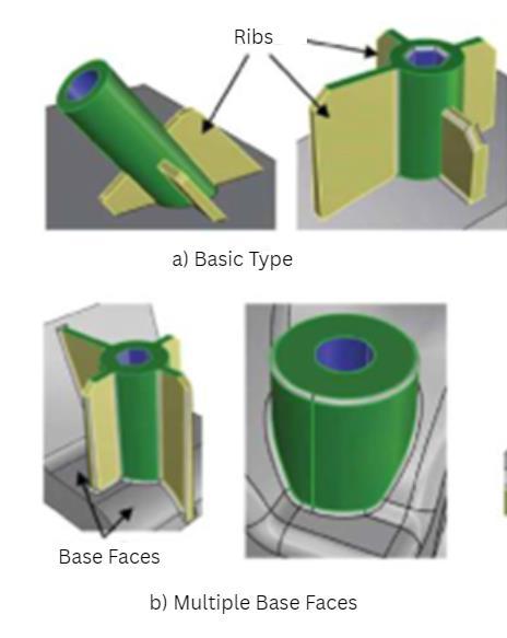 Advanced algorithms that automatically identify and recommend changes to these crucial features have been developedbecauseofthedevelopmentofCADtechnologies. Forexample,bymodifyingthesizeandplacementofribsin response to real-time simulation results, AI-driven tools integratedintoCADsystemscannowanticipateandmodify possible stress points in a design. Similar to bosses, CAD systemswithintelligentdesignalgorithmscanoptimizethe size and layout of bosses according to the applicationspecificconnectivityneedsandmechanicalloads.Fig4and Fig5showClassificationofafewcommontypesofRibsand Bosses.