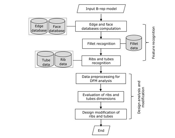 Thedevelopmentandmodificationofribsandtubesinthinwalled plastic injection parts significantly impact their manufacturability. The approach used for addressing the challenges posed by complex geometric features in such components involves integrating Design for Manufacturability (DFM) analysis with Computer-Aided Design (CAD) modifications. Key to this integration is an effective systemforrecognizing,analyzing,andmodifying specificfeatureslikeribsandtubes.[6]