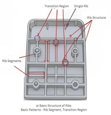 Ribs arethin,wall-likefeatures typically designedinto the geometryofaparttoaddinternal supporttowallsorother featureslike bosses.Similarly, gussetsaresupportfeatures thatreinforceareassuchaswallsorbossestothefloor.Just asbridgebeamsand columnsaresupportedattheirvertex with gussets to add critical strength to the structure, the sameconceptappliestoplasticinjectionmolding.Fig2shows aschematicrepresentationofRibsinaCADModel