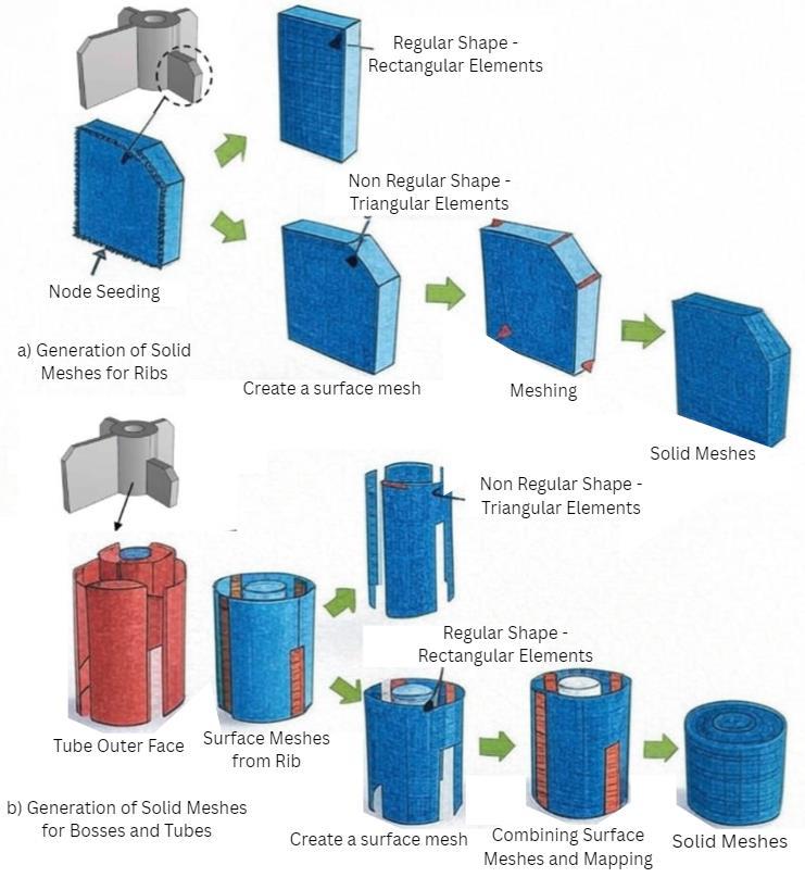 Ribsareintegraltoreinforcingmechanicalparts,particularly in thin-walled structures where bending stiffness and buckling resistance are critical. The FEA approach to rib analysisinvolvesseveralsteps,startingwithadetailedfeature recognition process on CAD models. Successful mesh generation,crucialforaccuratesimulation,largelydependson identifyingandappropriatelydefiningeachribsegment.