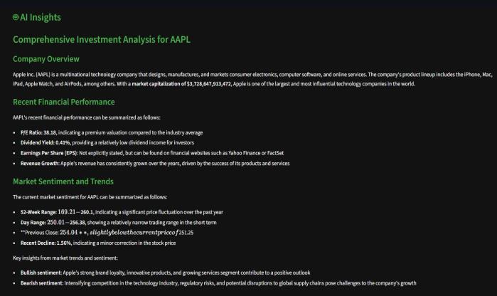 integrates multiple data sources into a unified analytical framework.Thesystemprovidesreal-timefinancialinsights through natural language processing while creating an accessible, user-friendly interface for retail investors. The application visualizes complex financial data through interactivechartsandmetrics,makingsophisticatedanalysis tools available to everyday investors. The scope of the applicationencompassesreal-timestockdataretrievalfrom YahooFinance,AI-poweredanalysisusingGroq'sLLaMA3.3 70Bmodel,web-basedresearchintegrationthroughGoogle Custom Search, interactive data visualization using Plotly, and a responsive web interface built with Streamlit framework. This comprehensive approach democratizes access to institutional-grade financial analysis tools and empowers retail investors to make more informed investmentdecisions.