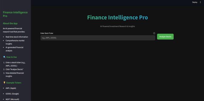 Itintegratesartificialintelligence,real-timefinancial data, and web research into a unified investment analysis platform designed for retail investors. It successfully combinesAPIsfromGroq,GoogleSearch,andYahooFinance, leveraging the LLaMA 3.3 model to deliver high-quality, contextuallyrelevantfinancialinsightsthroughanintuitive interface. While the platform makes advanced analysis accessible,itdependsonthird-partyAPIsandaccuratedata sources,currentlyfocusingmainlyonU.S.markets.Future plansincludeexpandingtoglobalmarkets,addingportfolio management, real-time alerts, predictive modeling, and mobile support. Overall, Finance Intelligence Pro demonstrates how AI can democratize financial research, offeringretailinvestorsinstitutional-leveltoolsandinsights forsmarter,moreinformeddecision-making.