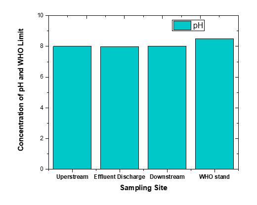 The pH value of water is closely related to its concentrations of carbon dioxide (CO2) and alkaline substances [28]. In this study, pH values were alkaline, ranging from 7.99 to 8.03, with no significant difference between treated effluent and river water, as shown in (Fig.7).This indicates low CO2 levels, which generally reducepH.ResearchonpH'seffectsonfoodandwaterborne pathogens is increasingly prevalent in laboratory and uncontrolled settings [29] The pH of pharmaceutical wastewaterfromvariousbatchprocessescansignificantly vary, ranging from very acidic to alkaline, often due to detergentresidueslikesodium-basedsoapspresentinthe treatedwater[30] Theriverwater'spHexceedsthatofthe treatedeffluent,potentiallyinfluencedbyadditionaleffluent fromtheBoleLemiindustrialpark,located8kmupstream. Furtherresearchisnecessarytoevaluatetheimpactofthis industrialdischarge.