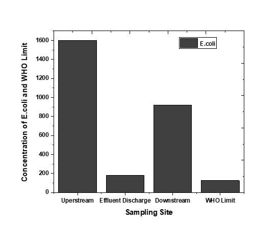 E.coliisabacteriacommonlyfoundintheintestinesof warm-blooded animals, including humans (Fig.17). While manystrainsareharmless,somecancauseseriousillnesses. The presence of fecal coliform bacteria in water indicates contamination from warm-blooded animal feces[41]. This means that the water has likely been contaminated with humanoranimalwaste.Fecalcontaminationcanintroducea varietyofharmfulpathogensintothewater,including[42]. Becauseofdilution,E.colilevelsaremoderatedownstream, lowest at the effluent discharge, and highest upstream. Sample A recorded 180 MPN/100 ml, Sample B 1600 MPN/100 ml, and Sample C 920 MPN/100 ml, above the WHO limit of 126 MPN/100 ml. Every sample has levels above safe limits, necessitating prompt source protection andremediationactions.