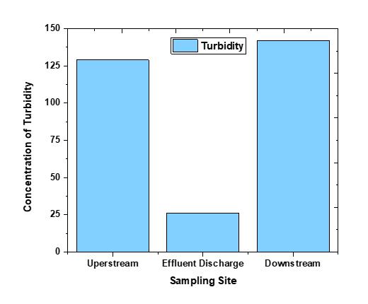 Asshownin(Fig.9)Turbiditymeasureswaterclarity; higherturbidityindicatescloudierwater.Variousmaterials causeturbidity,includingsilt,organicandinorganicmatter, clay,algae,andmicroscopic organisms.The turbiditytest resultindicatesthatitrangesfrom<20to142NTU(figure 2).Turbiditycanhindersunlightpenetrationtothewater's surface, limiting photosynthesis in aquatic plants and potentiallycausingcascadingeffectsthroughouttheentire ecosystem [31] High turbidity can impair the vision and breathingoffishandotheraquaticorganisms,asitmayclog their gills, making respiration difficult [32]. Turbid water absorbs more sunlight, leading to increased water temperatures.Thiscanstressaquaticorganismsandreduce their oxygen levels [33]. Water turbidity influences pollution levels in rivers. Our tests showed that the least turbidwateroriginatedfromthetreatmentplantdischarge, demonstrating its effectiveness in eliminating suspended solidsthatcontributetoturbidity.