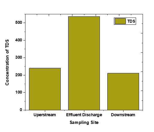 Conductivityindicateswater'selectricalconductivity; higher dissolved salts and inorganic chemicals increase salinity, reflecting a greater concentration of dissolved substances [34] Water conductivity can be affected by mineralsinthewaterbed,agriculturalrunoff,urbanrunoff, and industrial effluent.As shown in (Fig.11), the highest conductivity recorded was 1075 µs/cm in the effluent discharge, while samples B and C had values around 450 and 510 µs/cm. Notably, the effluent's conductivity exceededbothupstreamanddownstreammeasurements. Themixingofthehighlyconductiveeffluentwithupstream water led to a lower downstream conductivity of 510 µs/cm,likelyduetodilutionfromadditionaldischargesor mineral-absorbingalgaereducing mineral levelsbetween pointsAandC.