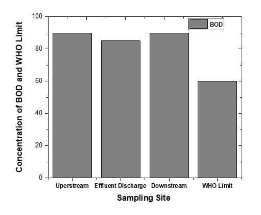 As shown in (Fig.15), BOD measures the oxygen requiredbymicroorganismstobreakdownorganicmatter in water, indicating pollution levels. High BOD suggests significantorganicwaste,depletingoxygen,whilelowBOD indicatesbetterwaterquality[38-40].BODlevelsarehighest in upstream and downstream samples and lowest at the dischargesite.SampleArecorded85mg/l,whileSamplesB and C reached 90 mg/l. These results indicate significant contaminationfromuntreatedsewageorindustrialwaste, necessitatingquickaction.TheWHOstandardis60mg/l.