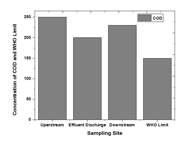 ChemicalOxygenDemand(COD)measurestheoxygen needed to oxidize organic matter in (Fig.13), Water indicatingtotal organicpollution.HighCODlevels suggest significant pollution, depleting dissolved oxygen and harmingaquaticlife,particularlyfishandorganismsreliant onoxygenforsurvival[35,36] Highorganicmatterlevels can lead to eutrophication, causing excessive nutrient buildupinwater thattriggersalgal blooms.These blooms deplete oxygen, resulting in fish deaths and making the waterunpleasantforuse[37]. ThetestresultsofCODlevels vary according to test results. The Water and Sewer Authority's findings confirmed low treatment efficiency, whereas the Environmental Protection Authority found increased COD from samples A to C. Significant contaminationwasindicatedbysamplesA,B,andC,allof which recorded 200 mg/l, 250 mg/l, and 230 mg/l, respectively,abovetheWHO's150mg/lstandard.