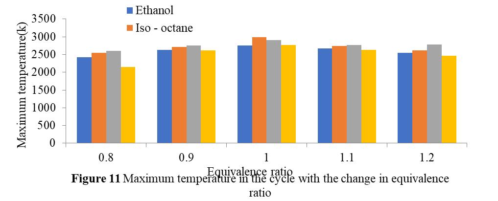 Figure 11 illustrateshowthetemperaturechangesinrelationtotheiso-octane,propane,methanol,andethanolequivalency ratios. The maximum temperature at which the product is found to occur after combustion is found to correspond to an equivalencyratioofone.Thisisbecauseallfuelsburnatstoichiometricconditions,andthemaximumtemperatureforricher fuelsdecreasesbecausetheydonotreceiveenoughoxygentoburn.Leanerfuelshaveenoughoxygentoburn,butbecausethey contain less fuel, less heat will be released during combustion, lowering the maximum product temperature above stoichiometricconditions.Additionally,itisnotedthattheiso-octaneinstoichiometricconditionshasamaximumtemperature.