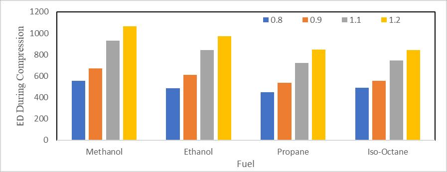 Thecalculationsandanalysispresentedaboveleadtotheconclusionthat,incomparisontothecompressionprocess,the combustionprocessdestroysthemostenergy.Theeffectofthereactantmixtureequivalencyratiosonthepercentageofenergy devastated for a constant volume process due to combustion and compression is being evaluated because methanol and ethanolvarywiththein-equivalencyratioindifferentways.Thevariationinavailabilityduringcompressionisalsoanalyzed using the shift in the equivalency ratio. The effect of the equivalency ratio change is evaluated because the engine's performanceisinfluencedbyboththemaximumtemperatureandcombustionefficiency.Itisfoundthatatstoichiometric conditions,energydestructionduringcombustionisnegligibleforbothselectedfuels.