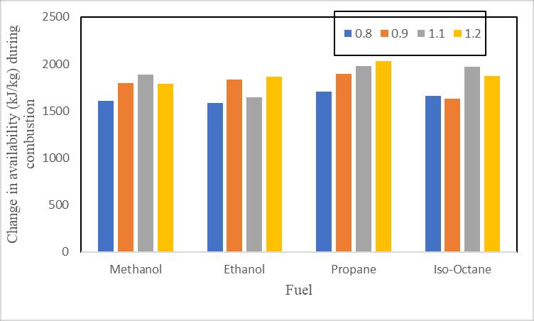 ratioforaconstantvolumeprocessinvolvingpropane,ethanol,methanol,andiso-octane.Theavailabilityvariationsduring compressionandcombustionarealsoexamined,inadditiontothechangeinequivalencyratio.Sincethecombustionefficiency andmaximumtemperaturehaveaneffectonthe engine'sperformance,theimpactoftheequivalencyratioadjustmentis assessed.Itisdeterminedthatforallofthechosenfuels,theamountofenergydestroyedduringcombustionisminimalatthe stoichiometriccondition.Intheprocessofburning,ethanolhadanenergydestructionrangingfrom20.8to30.1%,iso-octane from21.2to25.05%,propanefrom19.54to25.1%,andmethanolfrom14.07to29.6%.