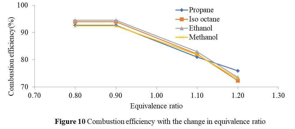Forethanol,methanol,propane,andiso-octane, Figure 10 illustrateshowtheequivalencyratiochangesinrelationtothe varianceincombustionefficiency.Itisdemonstratedthat,forallofthefuelsthatwerechosen,combustionefficiencyfallsasthe equivalencyratiorises.Thisisbecause,athigherequivalencyratios,fueldoesnotreceiveenoughoxygentoburn,leavingsome fuel unburned. It is also demonstrated that methanol has a minimum combustion efficiency and ethanol a maximum. Furthermore,itisnotedthatthedifferenceincombustionefficiencyislowestforpropane(17.99%)andlargestforiso-octane (23.04%).